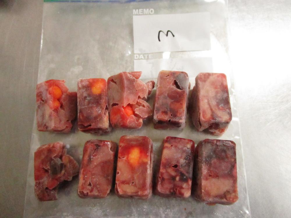 1袋10個入りです。写真は1つ解凍したものです。 活〆急速冷凍した群馬県産ウズラ使用。 小型~中型種におススメです。 1ブロックでウズラ半身分です。 骨をすべて取り除いているので、喉を痛める心配もありません。