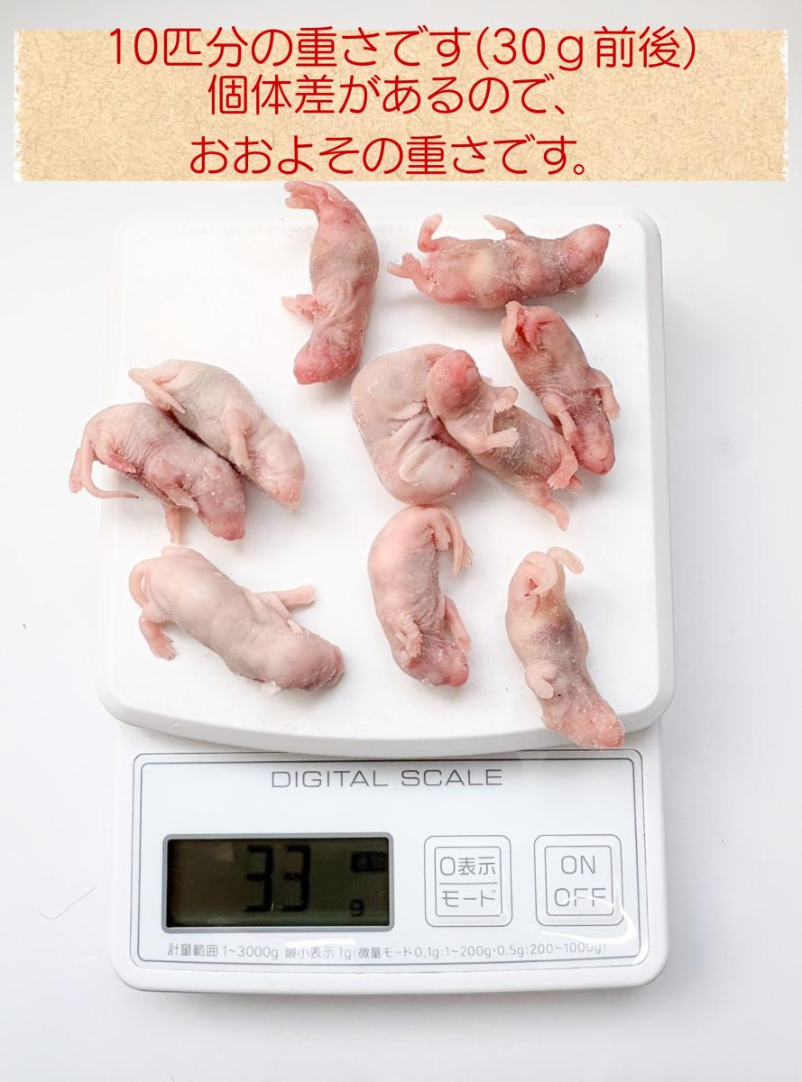 約3.5cm前後です。 嗜好性の高いピンクマウスです。中国産です。 骨まで柔らかいのでひな鳥や老鳥のおやつに最適です。 フクロウだけでなく肉食魚・爬虫類等の餌にも利用できます。 大きさ・重さには多少のバラツキがありますがご了承ください。